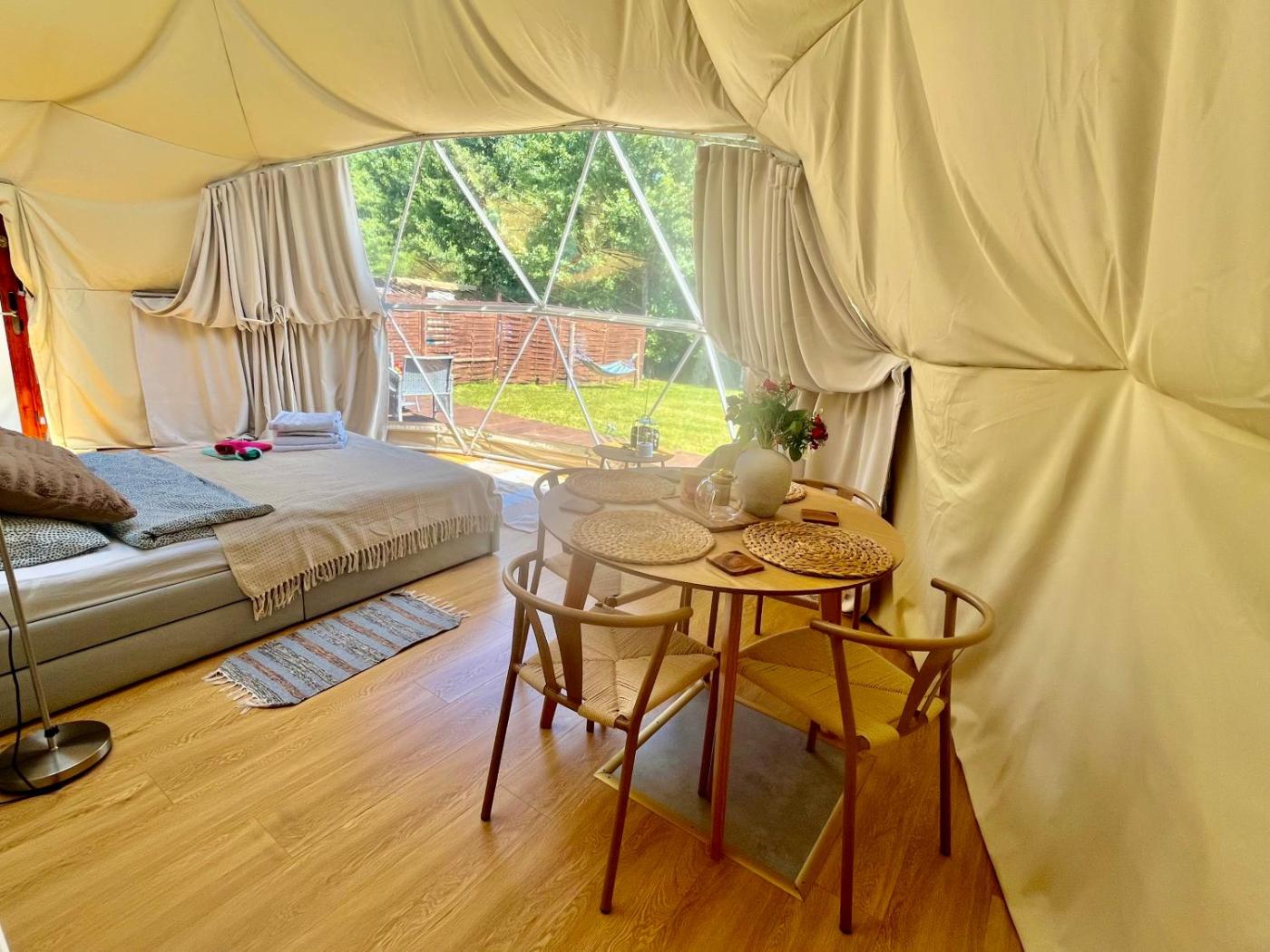 Namiot. Guests will find a stovetop, a refrigerator, kitchenware and a microwave in the kitchen. The tent also has a barbecue. The tent offers air conditioning, a private entrance, a terrace with garden views as well as a private bathroom featuring a shower. The unit offers 2 beds. Namiot - 4 osobowy. Powierzchnia pokoju ok.: 35 mkw.
